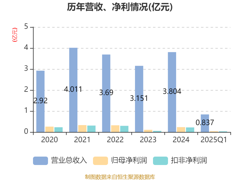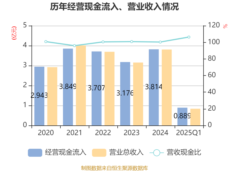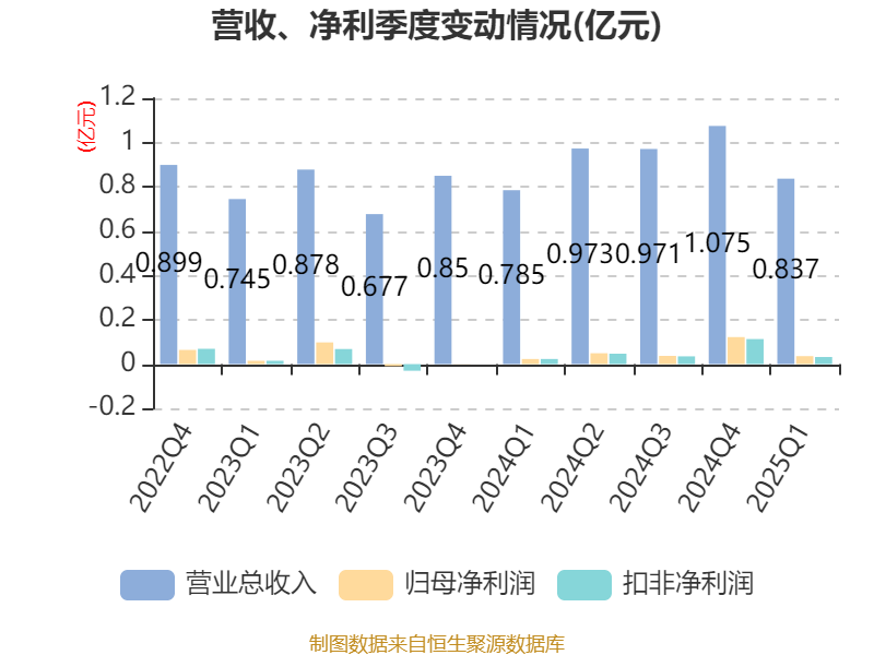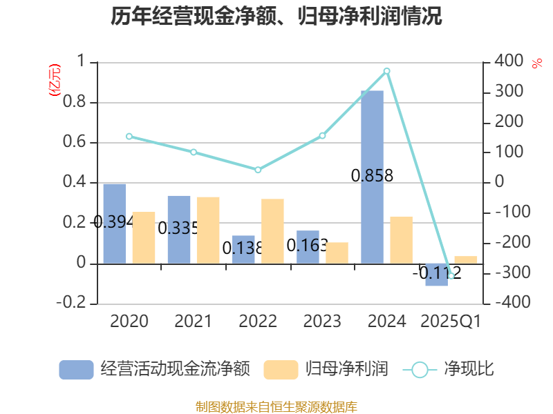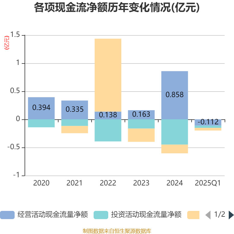 截至2025年一季度末,公司经营活动现金流净额为-1124.98万元,同比减少967.35万元;筹资活动现金流净额-478.73万元,同比减少200万元;投资活动现金流净额-390.15万元,上年同期为-820.23万元。
